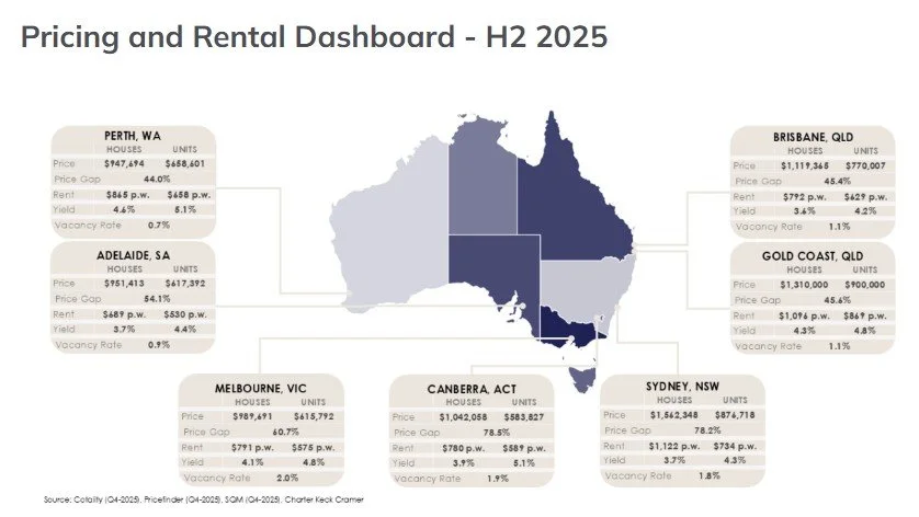 Overall, Charter Keck Cramer expects 2026 to be an improvement on 2025, supported by greater certainty and market adaptation to the new operating environment. While interest rates are expected to rise and lending serviceability buffers remain in place, price falls are not anticipated due to the widening gap between established housing values and the cost of delivering new supply, which is expected to place a floor under prices.