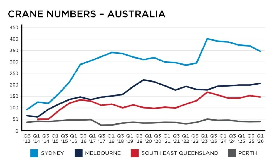While crane numbers have dipped slightly from 845 in the previous quarter, activity remains high and reflects a sector that is adjusting to new drivers of demand.