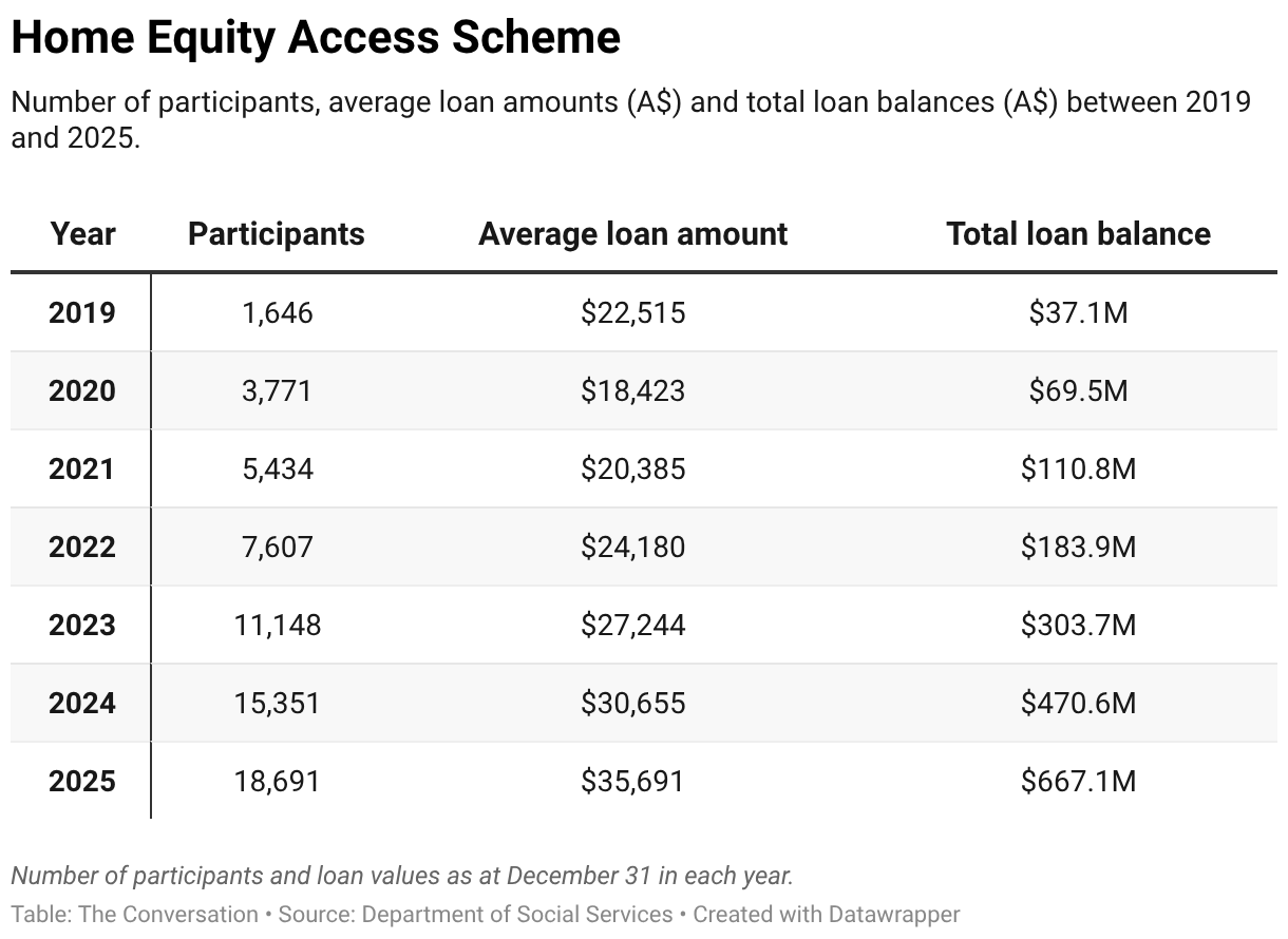 Government data on its scheme shows the average loan amount was about $35,700 in December 2025. Of those taking part, 74% received the full age pension, 17% received a part pension, and 5% were self-funded retirees.